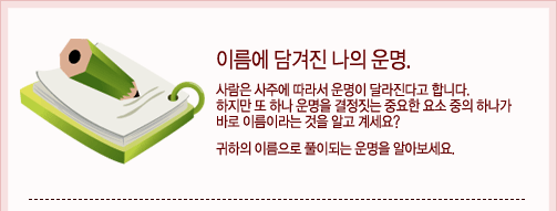 3. ¸¶Âù°¡Áö·Î ÀÚ½ÅÀÇ À̸§ÀÇ °¡¿îµ¥ ÀÚ¿Í ³¡ ÀÚÀÇ Ã¹ ÀÚÀ½À» ¾Æ·¡ÀÇ Ç¥ÀÇ " ¸ñ(ÙÊ) , È­(ûý) , Åä(÷Ï), ±Ý(ÐÝ), ¼ö(â©)" Áß¿¡¼­ ã´Â´Ù.